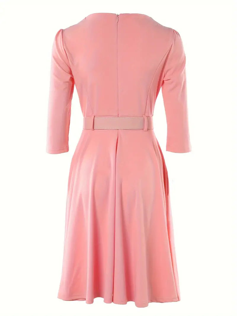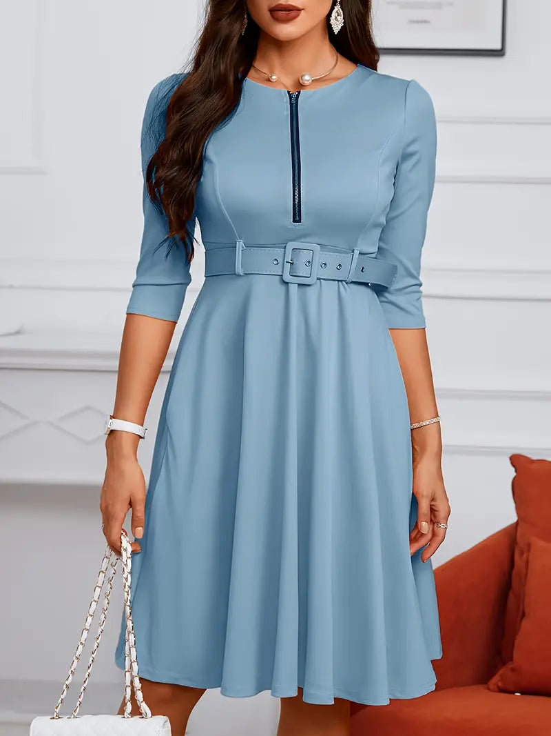 Dames A-lijn Jurk - Ronde Hals met Rits - 3/4 Mouwen - Tailleriem - Knie lengte - Met Zakken